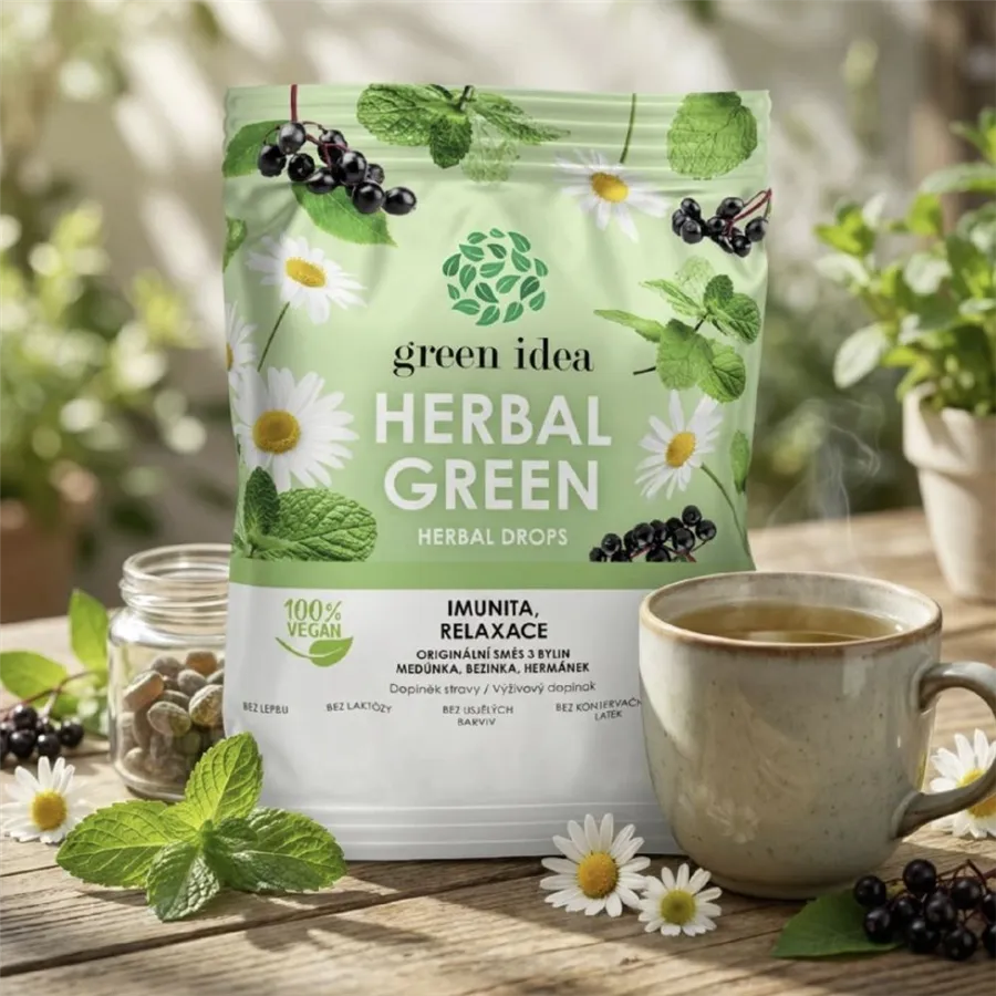 Bylinné bonbóny Herbal green obsahují extrakty z bylin (meduňka, plod černého bezu a heřmánek), které přispívají k dobré náladě a k relaxaci. Extrakty z bylin patří mezi přírodní antioxidanty, podporují přirozenou obranyschopnost. Mají harmonickou chuť, osvěží dech a přispějí k normální funkci dýchacích cest.
