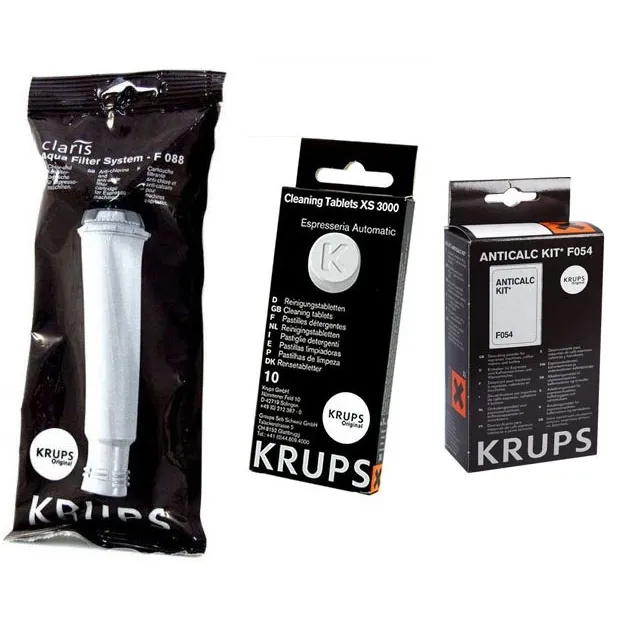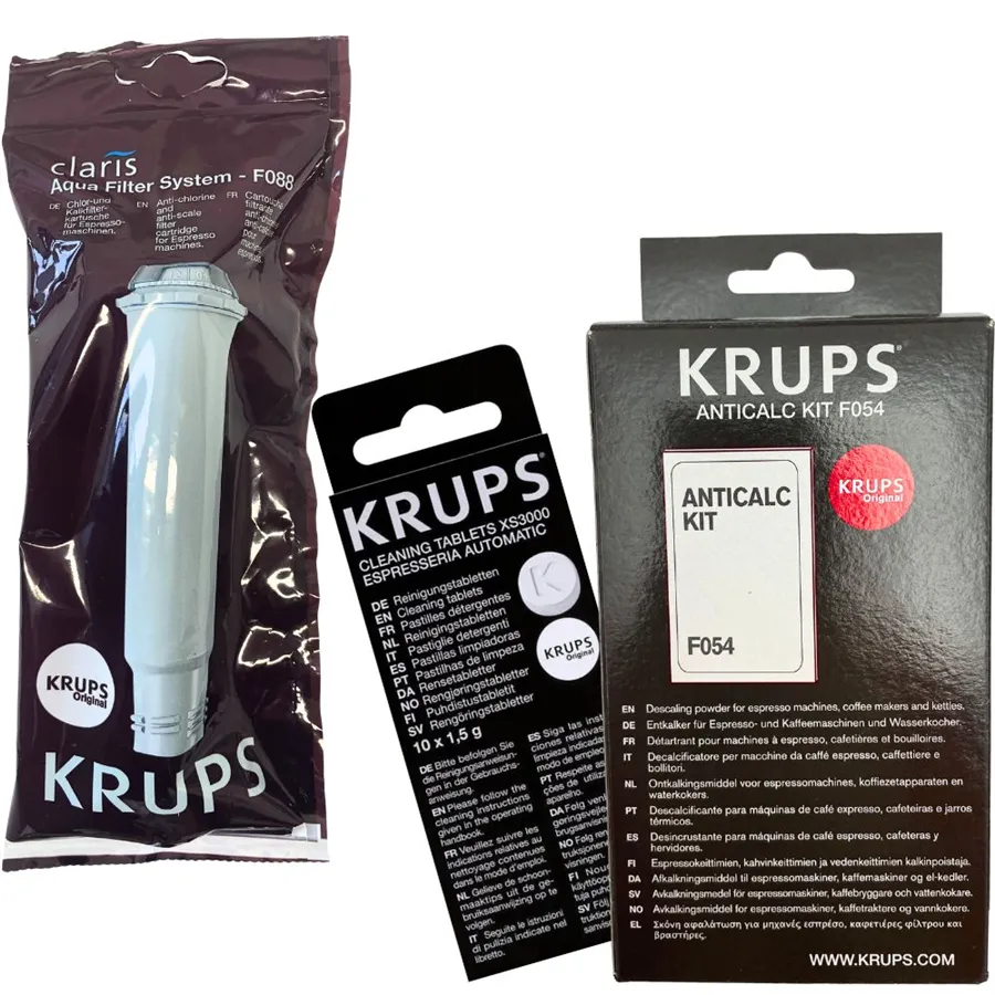 Součástí balení jsou 1 ks Krups F08801 Aqua Filter Claris + 1 ks Krups XS300010 čisticí tablety + 1 ks F0540010 odvápňovač do kávovaru.