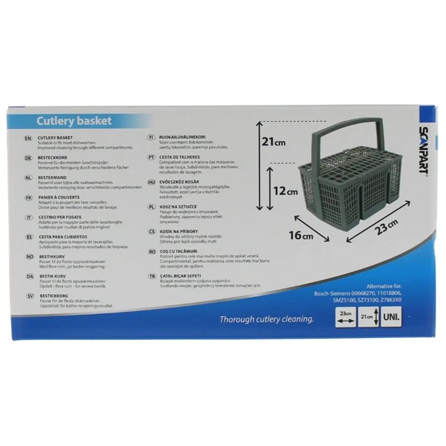 Hledáte spolehlivý košík na příbory do myčky, který pasuje do téměř každého modelu? Košík Scanpart v šedém provedení nahradí opotřebovaný díl a díky rozměrům 23 × 16 cm sedí do většiny běžně dostupných myček. Přihrádky uvnitř zajistí rovnoměrné rozmístění příborů.